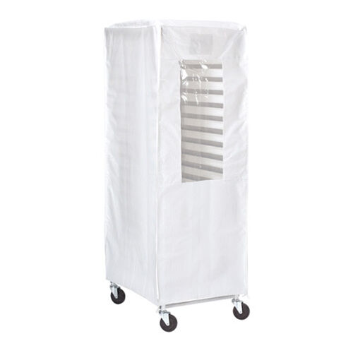 Ideal for transporting, proofing and maintaining food items in a clean, sanitary environment. Eliminates costly cleanup while providing excellent moisture and vapor barrier prolonging shelf life. Includes 5 zippers, 2 vertical seams and 1"/2.5 cm binding around seams and hems. Flame-resistant. PVC "bath method" coating over a polyester reinforcing scrim results in a superior quality cover for longer durability. Cover weight is 12 oz. per square yard. Translucent white color. Clear label pocket 6-1/2" x 5" (16.5 x 12.7 cm) and large view window. Hang strap on top seam. Mold and mildew resistant. Resists cracking to -40°F/-40°C.
