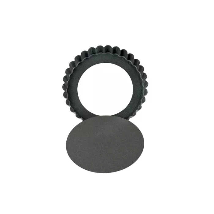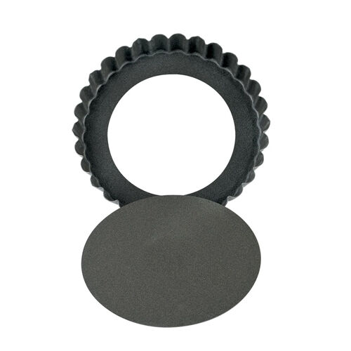 Non-stick coating quiche pan with a removable bottom. 4.75" diameter, 0.75" deep, low rim, non-stick coated steel, removable bottom.