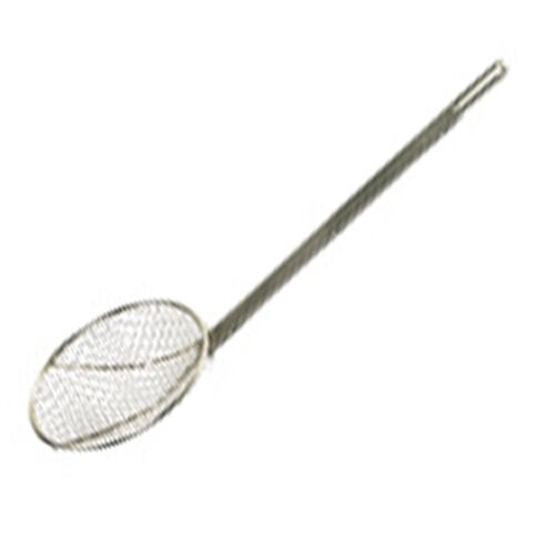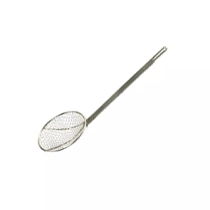 Nickel plated skimmer. The rigid, long handle displaces heat. Square mesh.