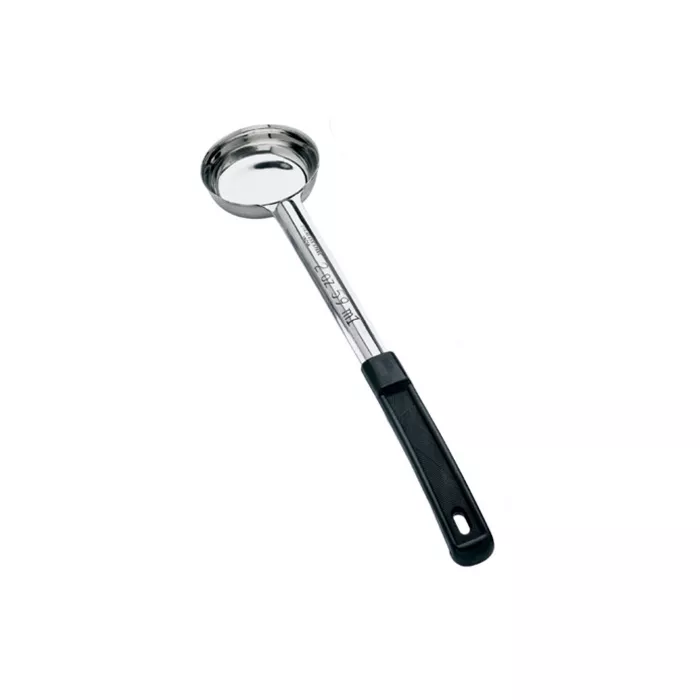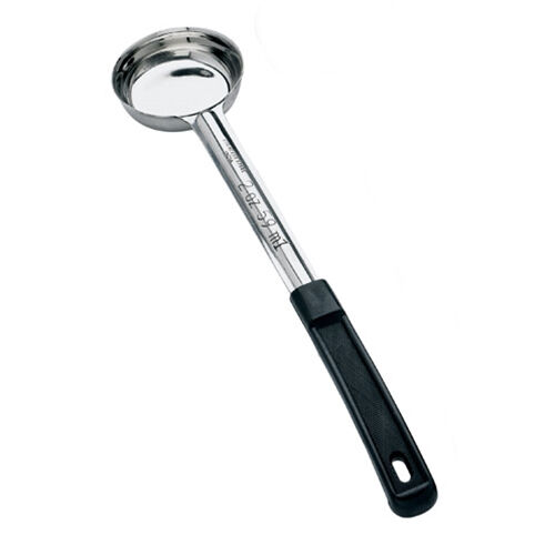 Stainless steel. One-piece construction. No weld joint where food can collect. Long, black polypropylene handle. 1.0 mm (.040") thickness.