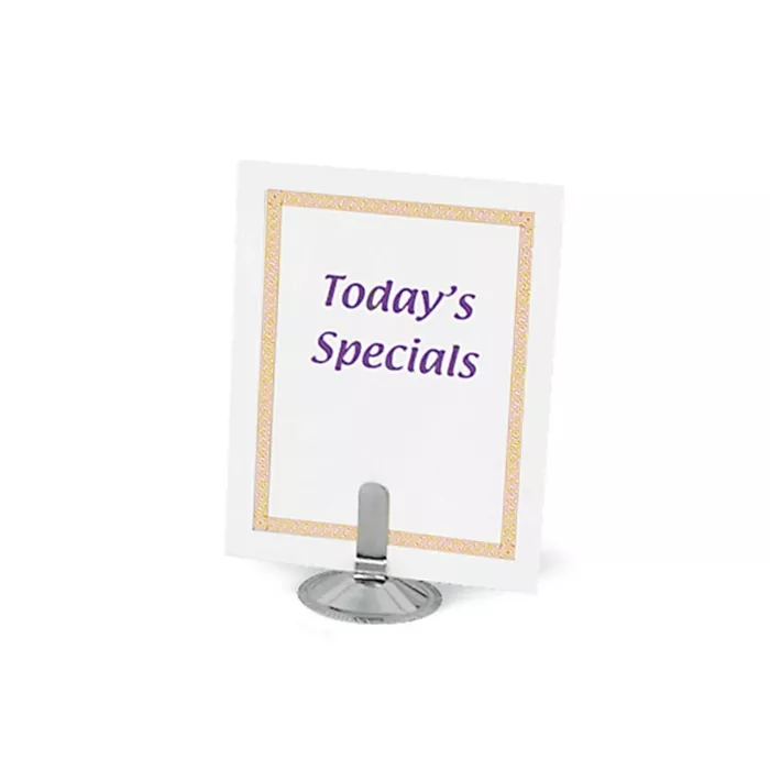 Stainless steel menu or card holder makes it easy to display specials, menus, and other promos on any table setting.