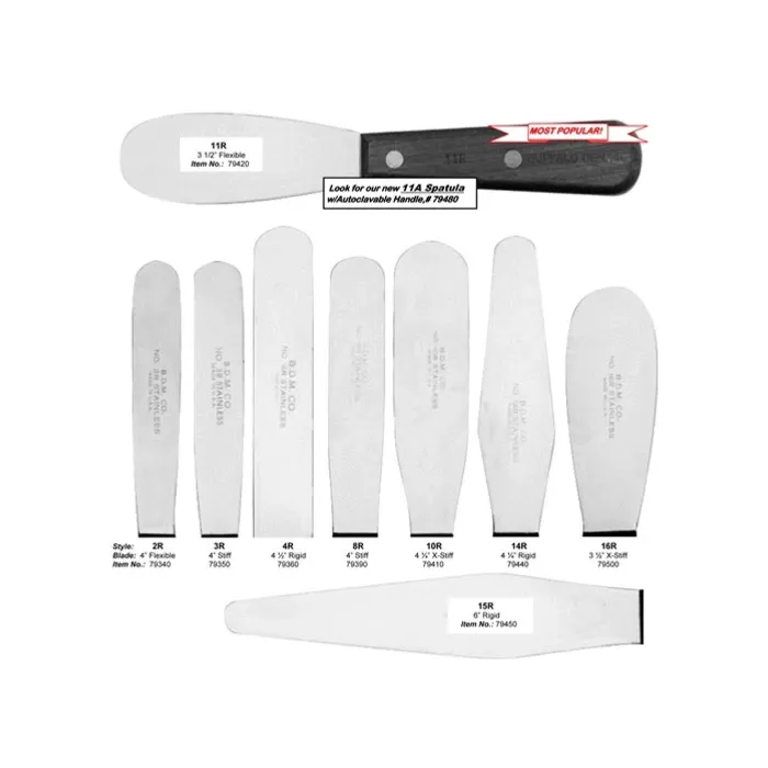La spatule Buffalo #11 avec une lame flexible de 3,5 pouces est un outil polyvalent et essentiel pour les laboratoires dentaires et les cabinets. Cette spatule est dotée d'une lame flexible en acier inoxydable conçue pour la précision et la facilité d'utilisation. Le manche ergonomique assure une prise en main confortable, ce qui la rend idéale pour diverses applications dentaires, notamment le mélange, l'étalement et le contournement des matériaux dentaires. Connue pour sa durabilité et ses performances, la spatule Buffalo #11 est un ajout fiable à la trousse à outils de tout professionnel dentaire.