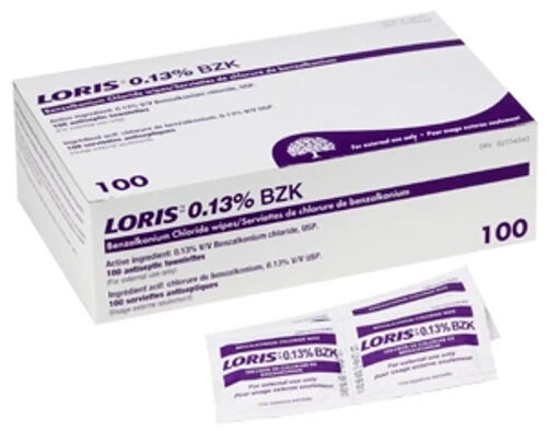 The Loris BZK towelette, is saturated with 0.13% Benzalkonium and is used as an antiseptic topical skin cleanser. 100/box, 20 boxes/case.| Brands | Loris |