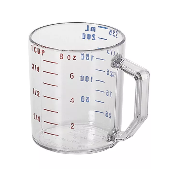 Perfect for measuring liquid ounces, pints, quarts or litres, ensuring an accurate measurement .They won’t dent like metal.Externally marked graduations in American standard and metric are molded-in. Made of rugged, virtually unbreakable Camwear® polycarbonate.Molded-in handle won’t break off.1 Cup