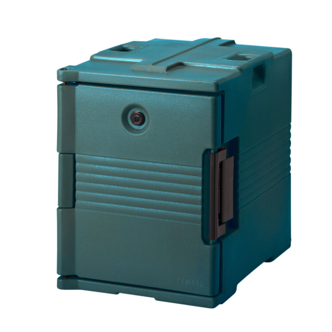 Take your catering to the next level with the reliable Cambro UPC400192 Ultra Pan Carrier Insulated Front Loading Sheet Pan Carrier and industry defining longevity of the Ultra Pan Carrier from Cambro! This UPC400 is rotomolded for one-piece, seamless construction, ensuring unmatched durability in transport and storage. Features ergonomic, unbreakable molded-in handles for two-person carrying, and a convenient nylon latch for fast access.
