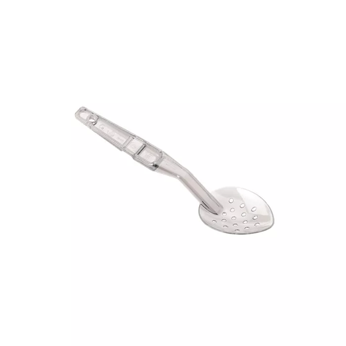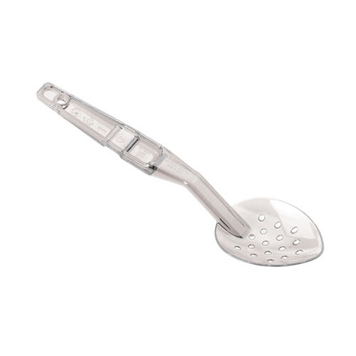 Use to stir, mix or serve cold or warm food. Made of virtually unbreakable Camwear® polycarbonate. Compared to metal, these spoons will never tarnish, bend or dent. A wide handle and molded in thumb rest ensures a solid, ergonomic grip. Handle includes a hole for hanging when not in use.