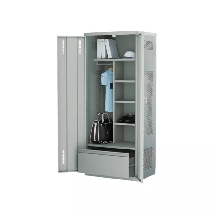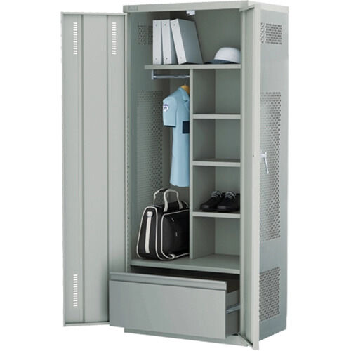 • Comprend trois demi-tablettes, une tablette pleine largeur, une barre de suspension, un tiroir latéral et des portes avec verrou