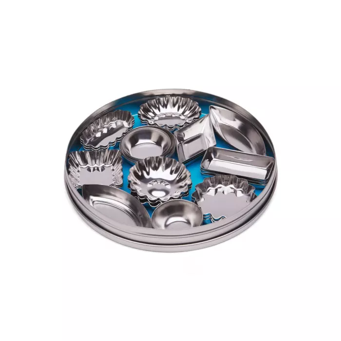 Create elegant, bite-sized pastries with the Overview. This collection offers a variety of shapes, including round, square, and fluted designs, all crafted from durable tin-plated steel. Conveniently stored in a handy storage tin, this set ensures easy organization and accessibility.