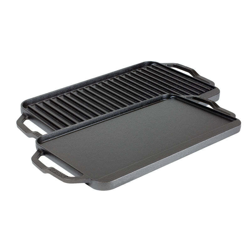 This Chef Collection Reversible Grill/Griddle provides excellent heat retention and distribution, and fits over two stovetop burners. With a design inspired by chefs, this grill/griddle has new lifted handles for an ergonomic grip and better control, no matter which side you're using. Each side also includes a drip tray to catch any grease, keeping your food lean and delicious. The large cooking surface is great for pancakes and eggs, grilled chicken, and steak. Seasoned to bring out rich flavors, this reversible grill/griddle is bound to become a favorite for years to come.