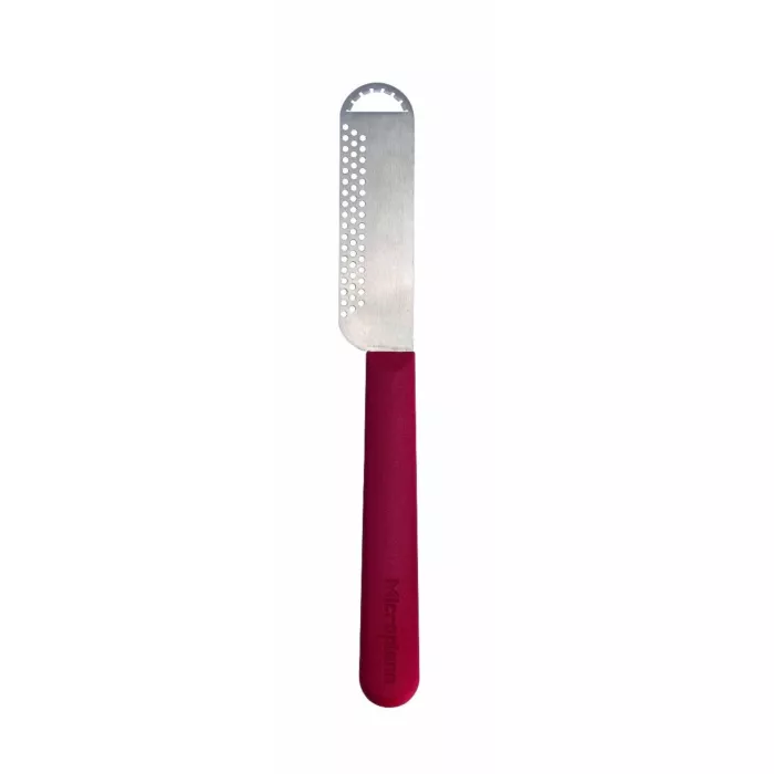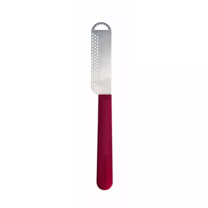 The Microplane Specialty Butter Spreader with Blade is smartly engineered with a uniquely designed and shaped blade that makes using butter blissfully easy. The topside of the Butter Blade cleanly slices pats of butter and easily cuts through paper wrapping with printed measurements for accurate cooking and baking. The bottom side of the Butter Blade features three rows of tiny holes that when pulled across a stick of butter, create soft strands that warm up rapidly to flawlessly spread on soft bread, toast, muffins, scones, corn on the cob, and more.