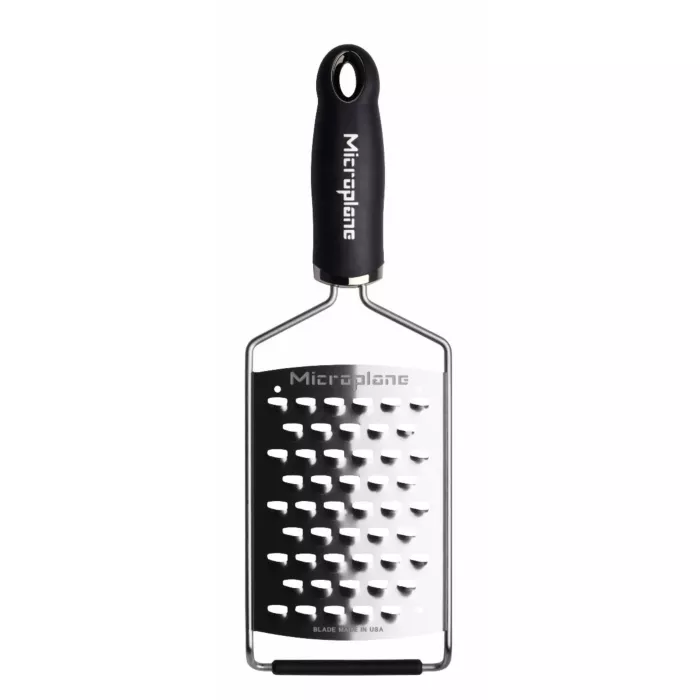 The Stainless steel frame provides extraordinary durability. The soft touch handle matches back to the premium classic series zesters. The non-skid foot adds stability when grating on counters and plates. The Ultra Coarse blade is 4" wide, much larger than standard paddle Cheese Graters. Which makes it the kitchen tool for recipes that need a larger amount of a grated ingredient. Shred large widths of hard and soft cheese, and use for softening butter.