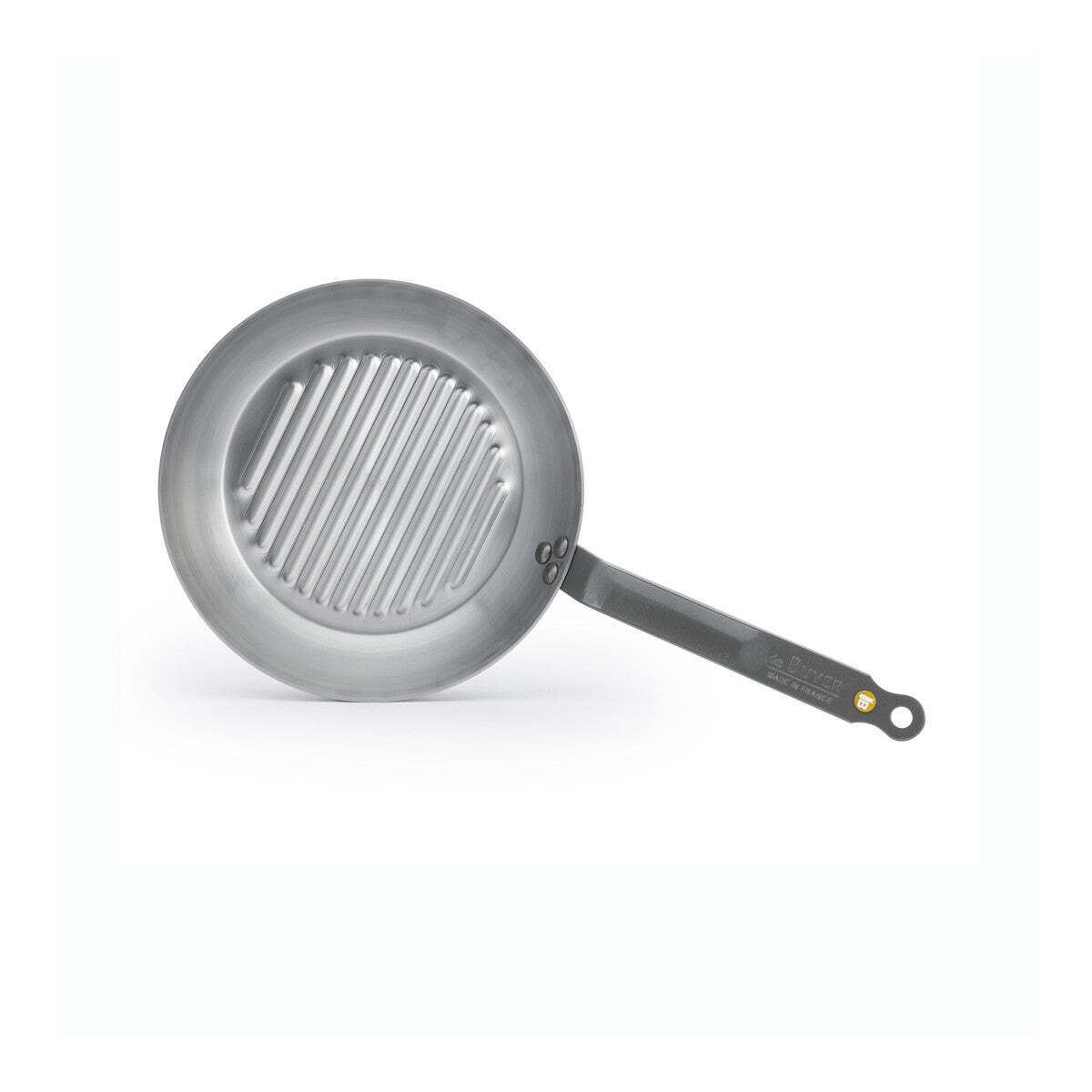 The De Buyer Round Grill Pan, crafted for superior searing, grilling, and browning. Made in France from heavy quality iron, this pan ensures exceptional caramelization and durability, perfect for home cooks and culinary enthusiasts.