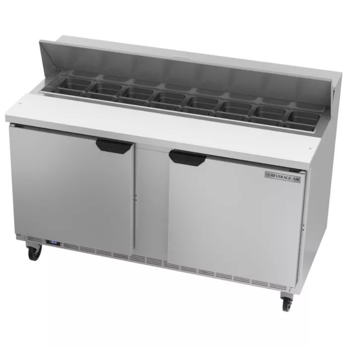 The Beverage-Air 60" Sandwich / Salad 16 Pan Refrigerated Prep Table, 2 Doors is a high-performance, 60-inch refrigerated prep station designed for commercial kitchens, delis, and sandwich shops. Featuring durable stainless steel construction, ample storage, and a removable cutting board, this unit ensures efficiency, convenience, and food safety.