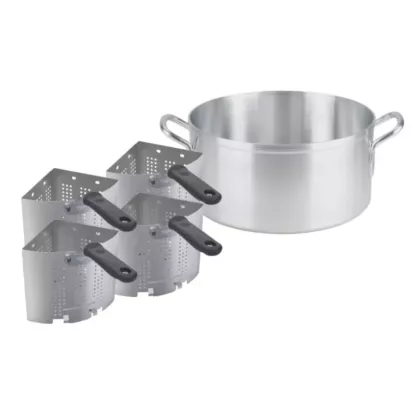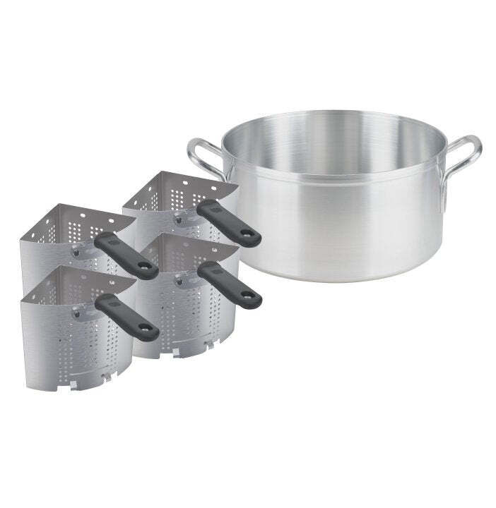 The Vollrath Wear-Ever® 14" Pasta Cooker Set includes an 18.5 qt aluminum pot and four 3 qt stainless steel insets, each with 3/16" perforations for easy draining. Comfort-grip and riveted inset handles, plus welded pot handles, ensure safe transport. Perfect for cooking multiple pasta servings simultaneously, this NSF-certified, USA-made set is ideal for restaurants or catering.
