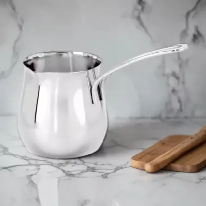 Cuisinox Stainless Steel Turkish Pot with Extended Lip, a versatile Turkish coffee pot for brewing rich, traditional coffee. With a 12-ounce capacity and wide pouring lip, this pot ensures spill-free serving, perfect for coffee lovers and warming milk alike.