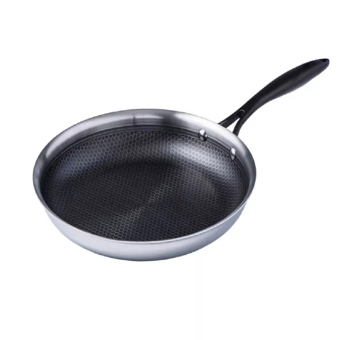 - Material: 3-ply clad stainless steel with raised stainless steel surface and PFOA-free stick-resistant coating