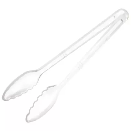 The Curv™ 12" Clear Serving Tongs are expertly designed for durability, control, and precision in foodservice settings. Featuring a curved design with specially rounded sides, these tongs easily reach into tight corners of pans or trays reducing waste and ensuring efficient serving. Constructed from heavy-duty polycarbonate, they provide exceptional strength and heat resistance from -40°F to 212°F (-40°C to 100°C), making them suitable for both hot and cold food applications.