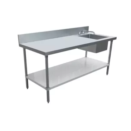 Maximize workspace efficiency with the Nella Stainless Steel Table with Sink, designed for cleaning, prep, and equipment support in commercial kitchen environments. Built with a durable 18-gauge 430 stainless steel top and a fully welded 304 stainless steel sink, this workstation is ideal for restaurants, bakeries and catering operations. The galvanized undershelf and legs provide strength and stability, while the integrated 6″ backsplash helps maintain a clean and sanitary prep surface.