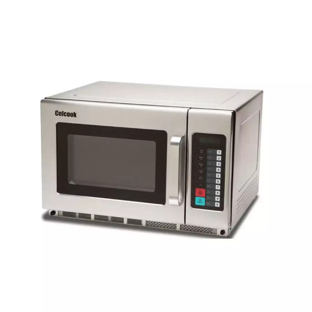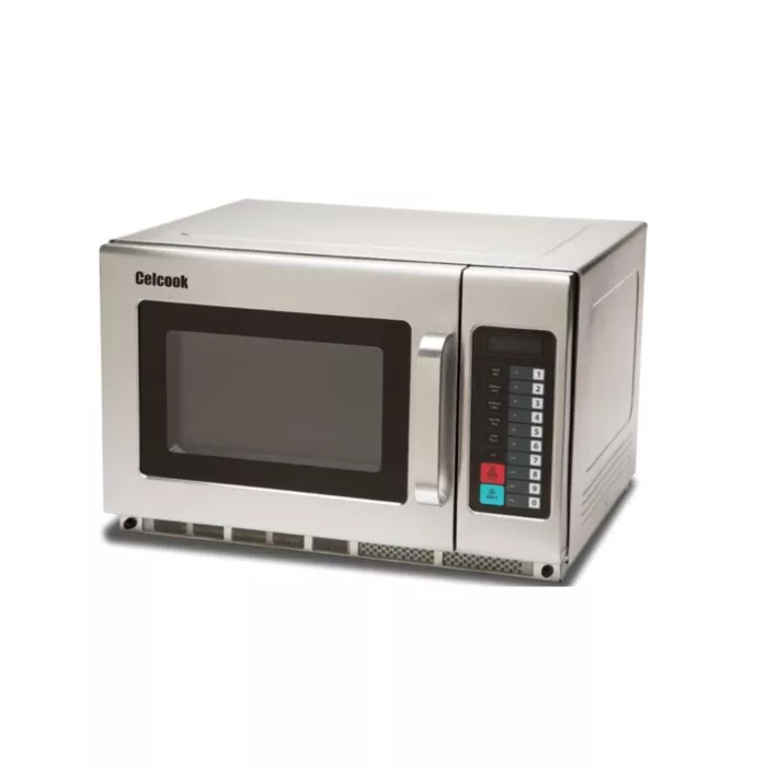 The Celcook High-Capacity Commercial Microwave oven is equipped with 10 touchpad programmable control panel with the ability to program 100 menu items. The oven has a maximum cooking time of 60 minutes with 5 power levels, 3-stage cooking, and a time entry option. Output wattage is 1200 watts with top and bottom rotating antenna feed distribution for a uniform heating pattern. The microwave has a stainless steel exterior and interior cavity with a 1.2 cubic ft cavity able to accommodate a 14” plate.