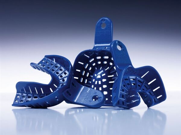 A patented system of intersecting ribs and rails provides unprecedented rigidity in a plastic tray. The anatomic form relieves the fitting and ensures a perfect impression. Autoclavable.