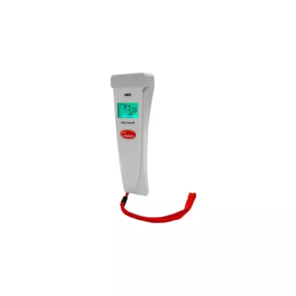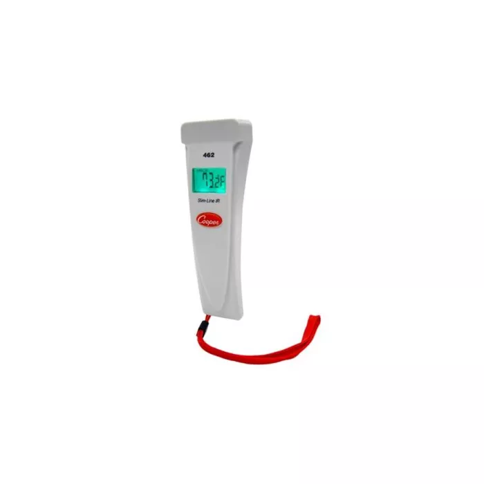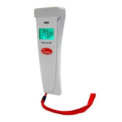 Dual-range infrared thermometer for noncontact temperature measurement for use in monitoring surface temperatures of food products and food service equipment