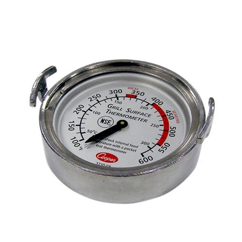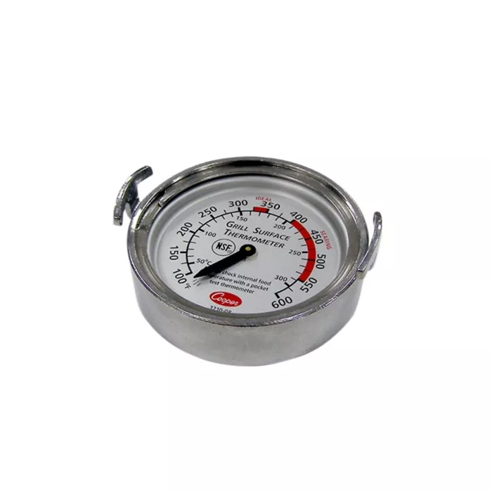 This grill thermometer features unique grips for easy removal from the hot grill surface.