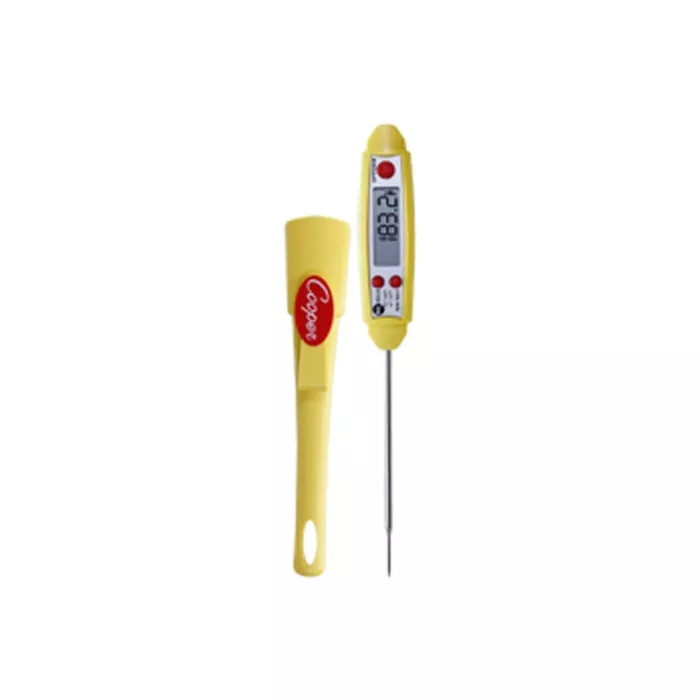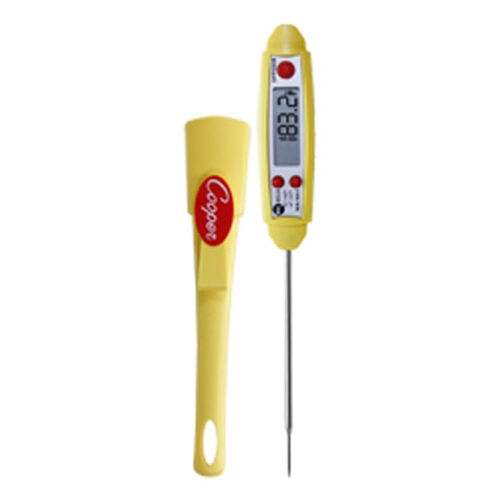 Has a Jumbo LCD, 12" reach with pock shealth and can be used to test dishwasher final rinse cycles. Sensor is located at the end of the reduced tip, providing a quick response time of less than 6 seconds. Has a large pocket clip with anti-microbial additive. Dishwasher safe. Temperature Range: -40° to 450°F (-40° to 232°C). Shaft length: 4" (102 mm), stainless steel stem.