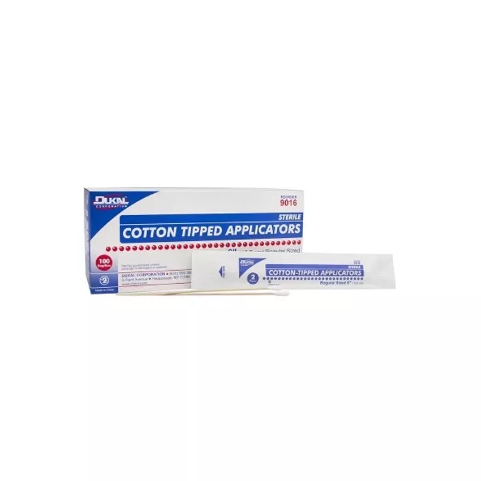 Each box contains 100 packages of 2 sterile cotton tip applicators, providing an ample supply for multiple procedures. The compact and organized packaging allows for easy storage and efficient use.