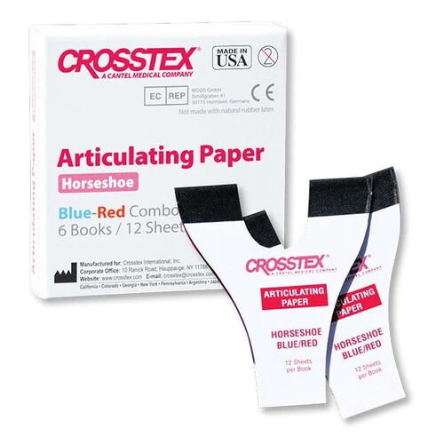 Le papier d'articulation Crosstex en forme de fer à cheval rouge/bleu est un outil dentaire de haute qualité conçu pour fournir un enregistrement précis de la morsure et une analyse occlusale. En forme de fer à cheval, ce papier d'articulation est facile à placer et à retirer, garantissant des marques de morsure claires et précises. Chaque boîte contient 72 feuilles de papier d'articulation durable et fiable, avec un système bicolore—rouge d'un côté et bleu de l'autre—pour une visibilité et une précision accrues.