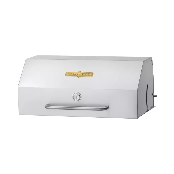The Crown Verity CV-RD-30/72 roll dome cover features durable, all stainless steel construction, a handle, and built-in thermometer, and is designed to fit 36" Crown Verity outdoor charbroiler grills, or half of 72" outdoor charbroiler grills.