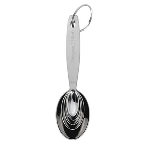 18/8 Stainless Steel. Oval design allows spoons to reach into the smallest jars. includes: 1/8, 1/4, 1/2, 1 teaspoon & 1 tablespoon.