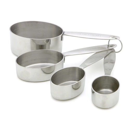 The oval design and long handles make it easier to scoop ingredients from canisters and tall jars. Thick, flat rims make it easier to level ingredients out with your knife, and a handy storage clip keeps them all together. Heavyweight cups are stovetop safe. Dishwasher safe. Set of 4.