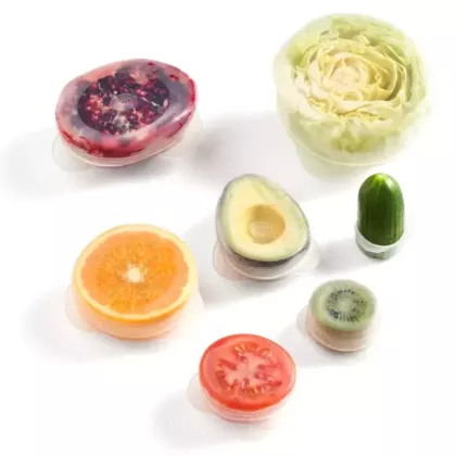 Introducing Overview,  a 7-piece silicone collection designed to keep your cut fruits and vegetables fresh without the need for single-use plastic wrap. These stretchable savers fit all shapes and sizes of produce, ensuring an airtight seal to maintain freshness.