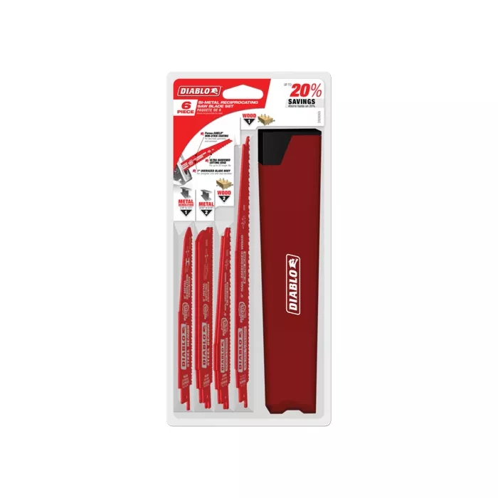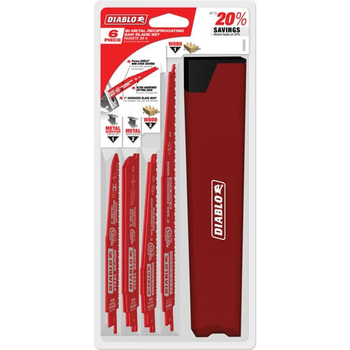 - Comprend : (1) lame de démolition 6" pour le métal (1/8" à 1/2") avec 8/10 dents par pouce, (2) lames de démolition 6" pour le métal (3/32" à 5/16") avec 14/18 dents pas pouce, (2) lames 6" pour le bois avec clous avec 6/12 dents par pouce, (1) lame 9" pour le bois avec clous avec 6/12 dents par pouce