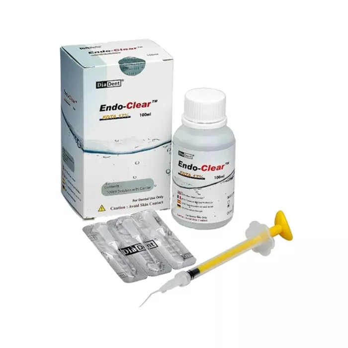 Endo-Clear is an EDTA root canal cleaner that is clear and colorless. It effectively cleans the canal and removes smear layer. Chelating effet of Endo-Clear softens root canal wall, dissolves and removes calcium. Endo-Clear is water-based so that it can easily reach narrow apical area and can be easily removed.