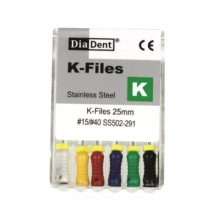 Diadent's stainless steel (SS) hand k files are available in standard ISO sizes, .02 taper. DiaDent's K-Files are designed to clean and shape root canals. It gives the users a smooth tactile sense inside the canal during instrumentation. - Exceeds all ISO/ADA specifications - Stainless steel files with endo stops - Color coded to save time - Designed to clean and shape root canals - Smooth tactile sense inside the canal during instrumentation 6 kfiles/pkg