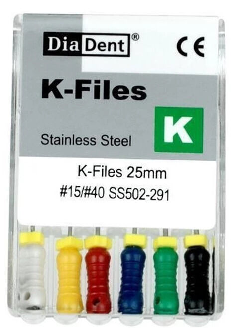 Diadent's stainless steel (SS) hand files are available in standard ISO sizes, .02 taper. DiaDent's K-Files are designed to clean and shape root canals. It gives the users a smooth tactile sense inside the canal during instrumentation. - Exceeds all ISO/ADA specifications - Stainless steel files with endo stops - Color coded to save time - Designed to clean and shape root canals - Smooth tactile sense inside the canal during instrumentation 6 kfiles/pkg