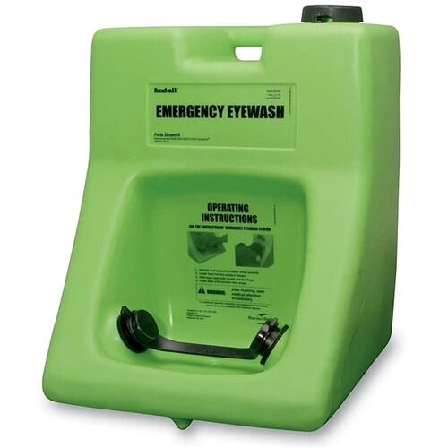 Fendall Porta Stream II® offers versatile portability and 15 minutes of uninterrupted flushing - without costly plumbing. Porta Stream II®'s simplicity of installation and operation has made it a popular choice in emergency eye care. Self-contained, it features a nozzle strap that is easily removed to activate flushing, leaving hands free to hold eyelids open. Can be easily and affordably placed near most workplace hazards with single bracket mounting device or transported with optional universal cart or universal stand. Molded handle accepts hanging bracket for vertical or horizontal surface installation. Comes with 180 oz eye wash.