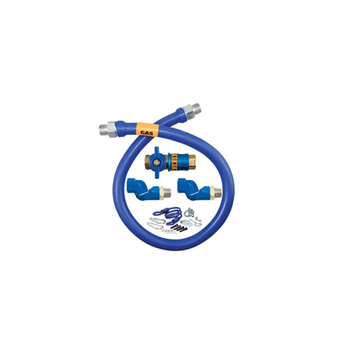 This 3/4 inch ID, 36 inch long moveable grade gas connector kit contains one connector composed of a 304 stainless steel corrugated tube covered with a tight weave stainless steel braid. The outside connector coating is an antimicrobial PVC coating that inhibits growth of bacteria, mold and mildew on the connector. Rotational technology fittings on both ends of the connector rotate 360 degrees, greatly reducing stress at both connector ends. The included push-to-connect quick-disconnect is designed specifically for the foodservice industry and contains a thermal shutoff feature. A restraining device and mounting hardware are also included.