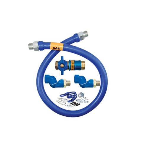 This 1/2 inch ID, 48 inch long moveable grade gas connector kit contains one connector composed of a 304 stainless steel corrugated tube covered with a tight weave stainless steel braid. The outside connector coating is an antimicrobial PVC coating that inhibits growth of bacteria, mold and mildew on the connector. This kit features a quick disconnect valve combination fitting designed for the foodservice industry and to meet the safety and operational needs of commercial kitchens. It consists of a full port brass ball valve, push to connect quick disconnect with thermal shutoff and an innovative carbon steel safety sleeve that is designed so the gas connector cannot be disconnected until the gas valve is shut off, and cannot be opened until the gas connector is attached. This kit also includes double swivels, two elbows, a restraining cable, mounting hardware and Safety-Set (TM) for proper equipment placement.