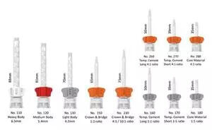 Embouts de mélange : Une variété d'embouts de mélange conçus pour un mélange précis et efficace des matériaux dentaires, y compris ceux pour les applications de couronnes et bridges.