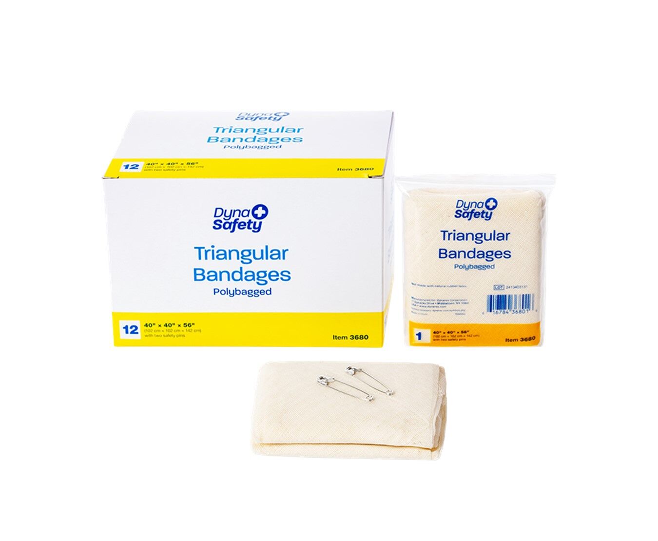 Dynarex DynaSafety Triangular Bandages are versatile, multi-functional bandages designed to safely and efficiently protect and support wounds and muscle injuries. These premium Bandages come with two safety pins to provide secure closure, improved support, and optimal adaptability.