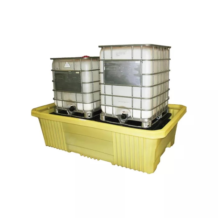 - Benne de confinement durable en polyéthylène à 100 % avec une résistance aux produits chimiques plus élevée que les GRV en acier comparables
