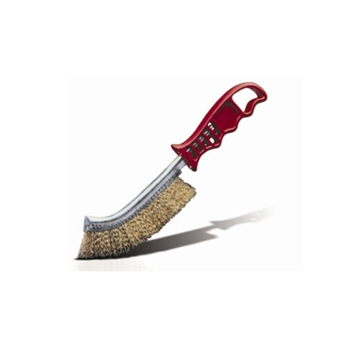 Brass bristle brush with plastic handle.