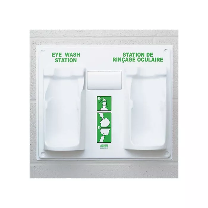 • Double station with two built-in sockets to secure two 946 mL (32 oz) eye wash bottles (item SCX04099)