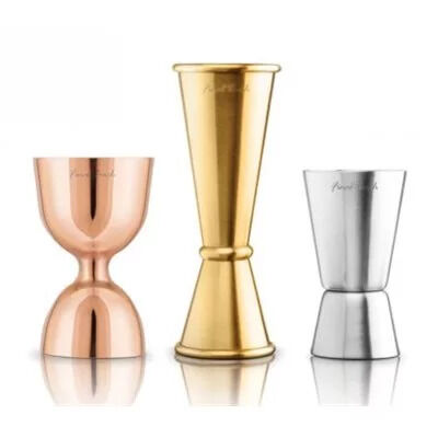 Includes three stainless steel jiggers in different finishes; copper, brass & stainless steel Two-sided – flip over for different measurements Measurement markings in oz & cL
