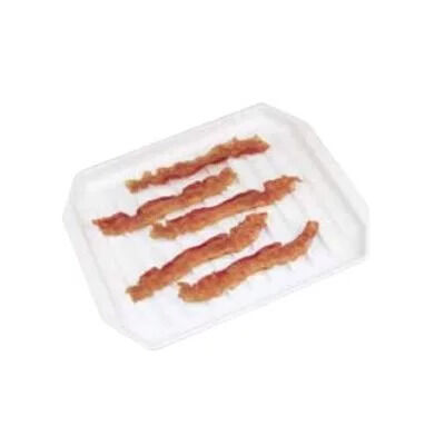 A microwave oven-to-table rack that allows for easy cooking of bacon.