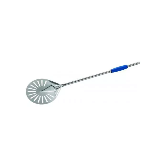 Turn and take-out small peel, perforated and entirely in stainless steel prevents the transmission of the heat from the oven. The handle base and interim sliding grip are in a specific high-density polymer, with high impact and heat resistance. The sliding element also slides into the bottom handle so that the stacked small peel with the head down can be immediately gripped correctly.