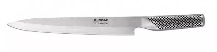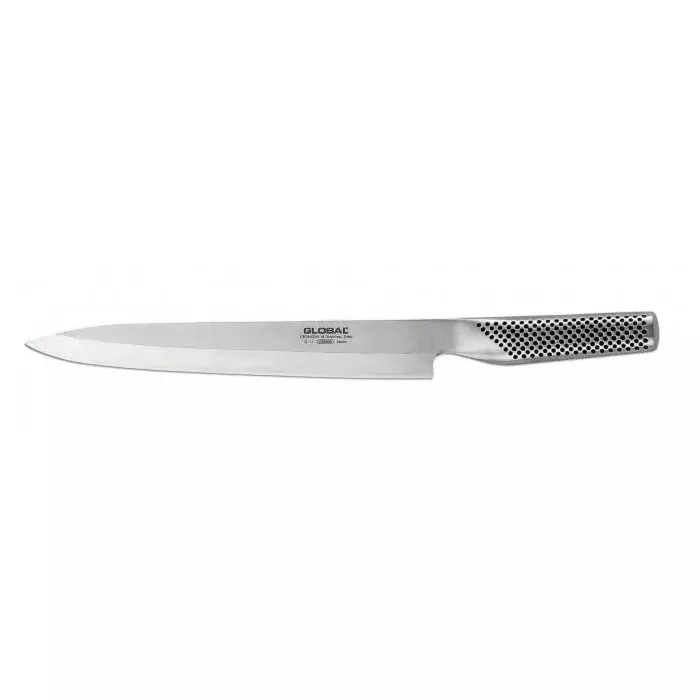 The left-handed Yanagi knife has a long and very thin blade specially designed to prepare sashimi, sushi, sliced raw fish, and seafood. The blade is purposely angled from one side and flat on the other. This allows sharper and more precision cutting and slicing from one side of the blade.