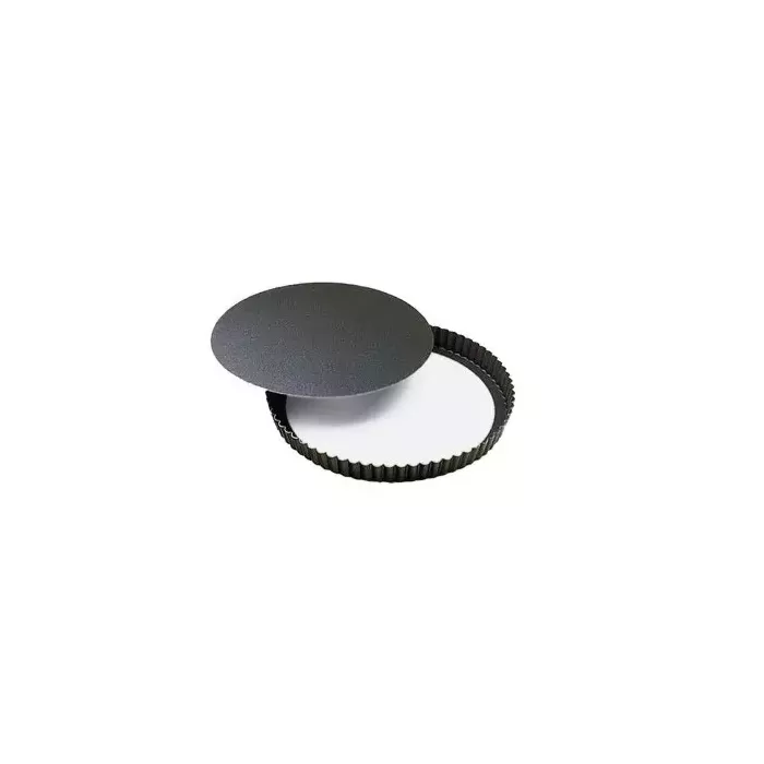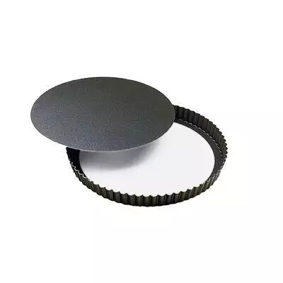Non-stick quiche pan with a 10.25" diameter and 1" depth. Features a removable bottom surface.